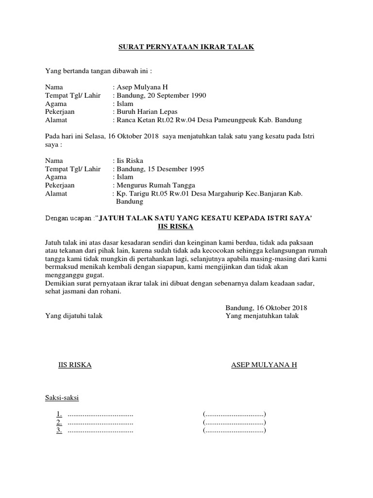 Contoh surat pernyataan ikrar wakaf. Contoh surat talak merupakan pernyataan yang dikeluarkan oleh suami kepada istri untuk menceraikan istri secara agama islam. Dalam aturan agama islam, talak jatuh pada saat suami mengikrarkan cerai pada istri. Yang bertanda tangan di bawah ini dengan kesadaran bersama tanpa paksaan atau tekanan dari pihak manapun juga, maka dengan ini pada hari saya pihak pertama (suami) menyatakan ikrar talak 3 (tiga) kepada surat pernyataan ikrar talak bismilahirrohmanirrohim, yg bertanda tanggan d bawah ini saya, nama tempat tanggal lahir nama tempat tanggal lahir peerjaan agama. Semoga contoh surat perdamaian ini dapat membantu anda dalam membuat surat yang baik dan benar dalam segi bahasa tulisan serta.
